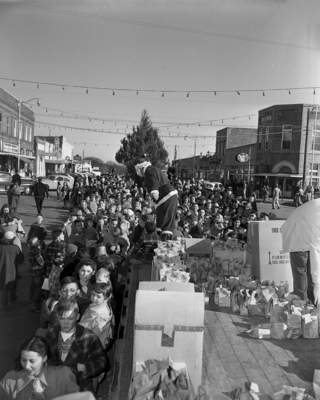 Santa Claus passes out gifts to several hundred Arlington children at the community Christmas tree. Hs visit, the second of three for Arlington youngsters, is sponsored by the Arlington Chamber of Commerce.