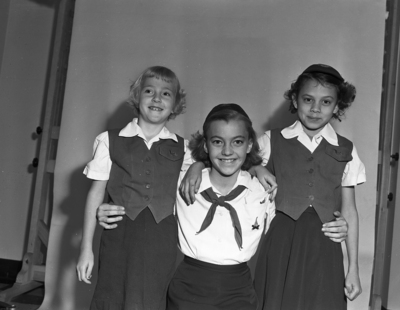 Blue Bird Lloydene Cloer, daughter of Mr. and Mrs. Lloyd Coer of 3862 Lambert Ct., left, was top winner in the Camp Fire Girls candy sale to raise funds for their camp, El Tesoro. Lloydene sold 252 boxes. Ann Stevenson, right, daughter of Mr. and Mrs. John L. Stevenson of 2426 Harrow, also a Blue Bird, was second place winner. Third place went to Linda Page, center, daughter of Mr. and Mrs. W. L. Page of 3637 Washburn, a Camp Fire Girl.