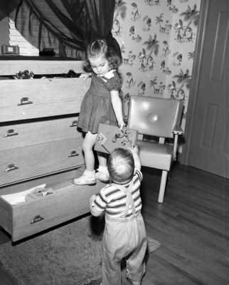 Using a chest of drawers as a stepladder, Janie Michero, 2 and a half year-old daughter of Mr. and Mrs. W. H. Michero of 2404 Westbrook, finds hidden Christmas presents. Eagerly co-operating in the pre-Christmas raid is her 14-month-old brother, Billy.