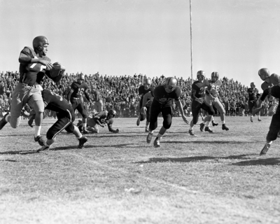 Charles Blanton, Newcastle back, drives toward a 16-yard kickoff return in the first period at Graham. The would-be Giddings tackler is unidentified. The return carried to the Newcastle 36-yard line. Published in Fort Worth Star-Telegram morning edition December 22, 1951.