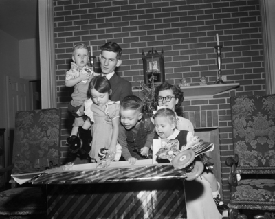 Lena Pope Home Babyland children, left to right, Gary Don Smith, Margaret Sue Henry, Tommy Neal Bransford and Karen June Hutsenpillor, look delightedly into the large box of gifts brought to them by Richard Dutton, Monnig's Distributive Education Club president, standing, and Shirley Flippo, club secretary-treasurer, seated.