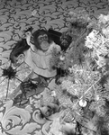 Cheeto, the chimpanzee, possibly fearing monkey business, jealousy guards its presents under the Christmas tree at the home of Zookeeper Clyde Smith. Cheeto, a 2 year old, got all dressed up for Christmas.