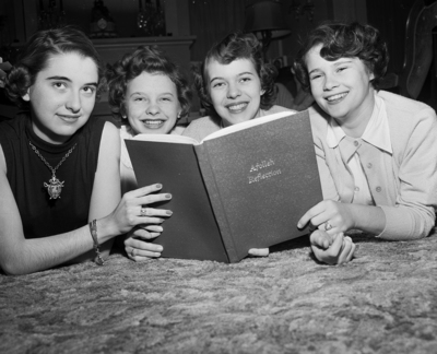 Four Paschal High School seniors turned back the pages of time and wrote a history of 14 chums. Left to right, they are Adelle Wood, Jean Dorris, Mary Clay Senter and Barbara Hellman. They gave the book as Christmas gifts to others in a group of girls who went through McLean Junior High School and on to Paschal.