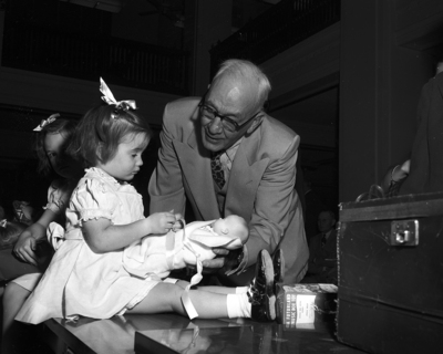 Rosemary Rudkin shows J. Lee Johnson Junior, First National Bank president, what Santa Claus brought her.