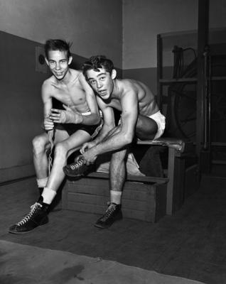 Flyweight Sonny McConnell (left) and Bantam Bob Shelton dress for a workout at the Golden Gloves-National Guard gym. They're training for the regional tournament at Will Rogers Memorial Coliseum, where they'll compete for Coach Vernpn (Buster) Brock's White Settlement Club. Published in Fort Worth Star-Telegram morning edition December 26, 1951.