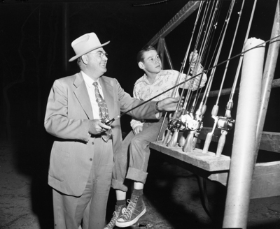 Father and son, both champion casters with a fishing rod, are C. L. (Bob) Bigley, and his 12-year-old son, Charley, having a look at a rack of rods and reels at the Fort Worth Anglers Club casting pool in Trinity Park.