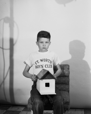 James Royall, 3617 North Main, 11, member of the Fort Worth Boys' Club, sports the club's T-shirt he won for building the best bird house. A bird house contest has been under way at the club's craft shop for the last six weeks.
