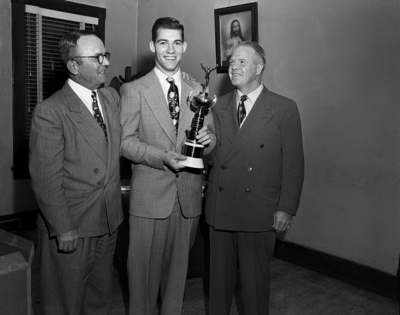 Don Harris grins happily between Texas Christian University Coach Dutch Meyer (left) and Jimmy Jay at Laneri football banquet. Don holds Jimmy Jay Award as the Micks' most valuable player this year. Published in Fort Worth Star-Telegram morning edition December 28, 1951