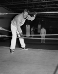 After a two-year layoff from the ring, Mickey Parr, a Birdville product, crawls through the ropes at the Golden Gloves National meet at Will Rogers Memorial Coliseum. Mickey's an open lightweight. Published in Fort Worth Star-Telegram morning edition December 26, 1951.