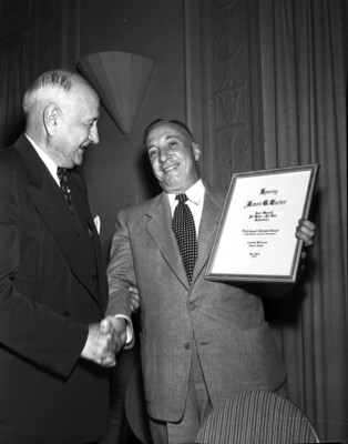 Amon Carter receives from Web Maddox a scroll honoring Mr. Carter as "Fort Worth's All Time Salesman." Both men are standing on a stage and are wearing suits and ties.
