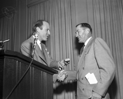 Image shows Everett Haley of J.P. Bowlin Company as he received awards at the 23rd Annual Salesmen's Banquet in Hotel Texas. Haley has won the honor before.