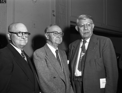 Left to right, Henry E. Bucher, 76 year old salesman and broker for smokers' supplies and oldest salesman present; D. A. Fielder, Waples-Platter Company salesman whose 53 years at the business made him the oldest present in point of service and Jack Frost, another Waples-Platter salesman with a half-century of selling to his credit.