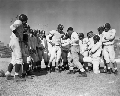 Texas Christian University Line Coach Allie White gives last-minute instructions in workout at Amon Carter Stadium. Norman Hughes, senior tackle from Fort Worth, is helping White with demonstration. Published in Fort Worth Star-Telegram evening edition December 29, 1951