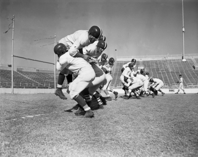 Texas Christian University linesman tug, push and lift their next-to-last workout on home grounds before the Cotton Bowl game. Nearest camera, left to right, are Douglas Conaway, Tom Evans and Norman Hughes. They'll go to Dallas soon. Published in Fort Worth Star-Telegram morning edition December 29, 1951.