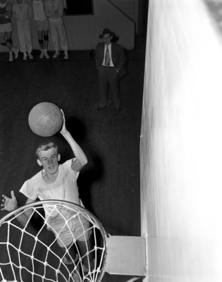 Image shows Paschal Basketball drills. Paschal's Bill Sanders (centered) goes high for a layup shot in drill as Panthers read for state City Conference tournament. Sanders led City scorers with 266 points in 25 games.