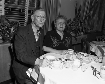 First visitors here for the convention of the American National Cattlemen's Association are Mr. and Mrs. Henry P. Hansen of North Platte, Nebraska, shown at breakfast at Hotel Texas.