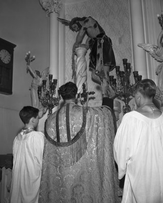 Reverend L. M. DeFalco, first assistant at St. Patrick's Catholic Church, blesses a new altar in the church's south vestibule. Flanking him are Altar Boys Dennis Yeager and Anthony Witkowski.