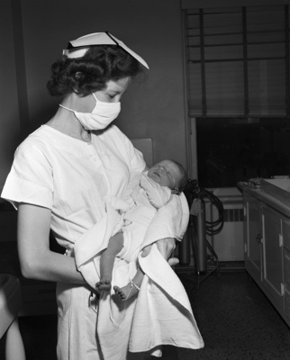 Fort Worth's First 1952 baby, Richard Midgett held by Nurse Mary Moore.