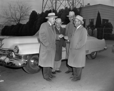 Coach L. R. (Dutch) Meyer gets keys to a new Cadillac presented him after Cotton Bowl game by Texas Christian University (TCU) ex-lettermen's association. Dan Rogers, Davey O'Brien and L. C. (Pete) Wright are shown with Meyer outside Frogs' dressing room.
