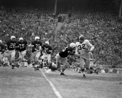 Five Kentuckians pursue Frogs' Bobby Jack Floyd (32) as he picks up 14 yards on this fourth period scamper at the Cotton Bowl game. Wildcats are Emery Clark (26), Jim Mackenzie (75), Tommy Adkins (31), Ted Kirn (85) and Ray Correll (65). Published in Fort Worth Star-Telegram morning edition January 12, 1952.