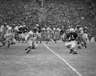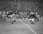 Kentucky twin Harry Jones, hotly pursued by Texas Christian University' Herbert Zimmerman (62), makes two yards on this third quarter play in the Cotton Bowl. Other Frogs are Sammy Morrow (11), Bill Mattern (46) and Hal Lambert (63). Wildcats won. Published in Fort Worth Star-Telegram evening edition January 12, 1952.