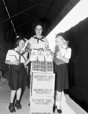 A boxcar with a sweet load of more than 20,000 boxes of Hollywood stars candy mints arrived at its destination. The camp Fire Girls, Fort Worth are shown on hand when the first boxes were opened were, left to right, Carolyn Maco Bellamy of 2210 Prairie, a Camp Fire; Jane Stewart of 116 North Judkins, Junior High Camp Fire, and Patricia Hatley of 3632 Norfolk, Blue Bird.