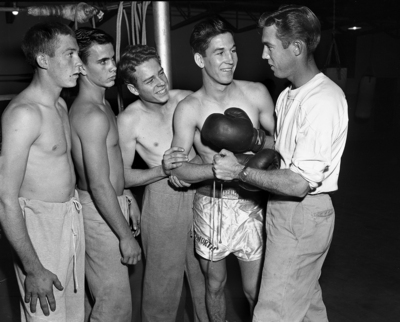 Bobby Young, who coaches Handley entries in the Fort Worth Regional Golden Gloves tournament, puts gloves on James Hendley, novice lightweight. Left to right are Jimmy Eblen, high school welter; Gene Barnett, high school lighweight: Richard Martle, high school feather, Hendley and Young. Published in Fort Worth Star-Telegram evening edition January 4, 1952.