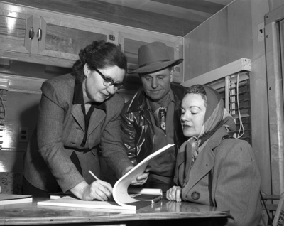 Among the first downtown shoppers to pay current poll taxes in the convenience of a trailer substation set up by Fort Worth Jaycees at 2nd and Houston were Mr. and Mrs. G. Z. Prince of 2425 Tierney Road, right. Serving them is Mrs. J. E. Adkins, a tax deputy. The trailer substation is one of four operated by the Jaycees.
