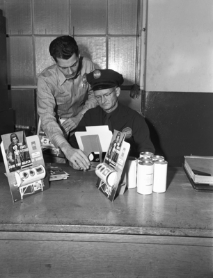 Two of the many Coca-Cola Bottling Company employees helping the March of Dimes campaign are shown assembling miniature iron lung coin containers distributed by the firm's route men. Pictured here are Charles Phillips, left, and George Mercier.