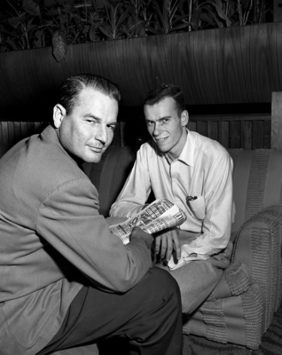 Coach Thurman (Slue) Hull (left) and one of his star Texas cagers, 6-8 Ted Price, engage in hotel lobby session on eve of clash with Texas Christian University at Will Rogers Memorial Coliseum. Price has scored 153 points in 11 games ranks second in league. Published in Fort Worth Star-Telegram morning edition, January 05, 1952.