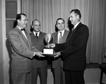 Dr. Rhea Williams, left, athletic director if the University Interscholastic League, presents Conference 2A football trophy at Arlington banquet. Accepting trophy are Coach Mayfield Workman, Principal J. W. Martin and Arlington Superintendent of Schools Ross Wimbish. Published in Fort Worth Star-Telegram morning edition January 5, 1952.