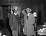 Band leader Joe Reichman, right, who will complete his successful engagement at the Keystone Room of Hotel Texas, is shown thanking Managing Director Andy Anderson of the hotel for affording three opportunities: first, to play for the Christmas Tree party of Lena Pope Home in the First National Bank lobby Christmas Eve; secondly, to play for Margaret Phelan when she sang at the closing program of the Star-Telegram Christmas tree and finally to participate in the Margaret Phelan-Desmon Runyon cancer benefit show at the Will Rogers Memorial Auditorium.