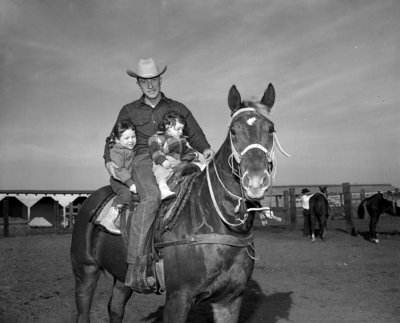 Don McLaughlin of Colleyville, Tarrant County, gives his two daughters, Kathleen, 1, and Donna Jean, 3, a ride aboard Red, his favorite roping horse. McLauglin was announced as national calf roping champion of 1951 by the Rodeo Cowboys Association.