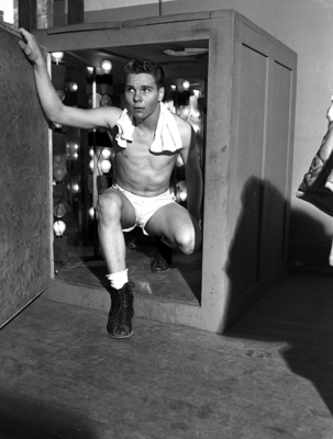Robert Purnell of Poly sweats off excess poundage in order to make welterweight limit. He'll fight in the high school class. Published in Fort Worth Star-Telegram morning edition January 6, 1952.