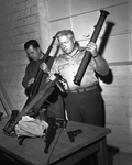 Master Sergeants Joe Henderson, left, and William C. French, right, prepare weapons to be used by Organized Army Reservists in home station training at the ORC Armory on Blue Mound Road this week-end. French cleans an M-1 Garand rifle while Henderson assembles a bazooka.