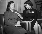 Attending the American National Cattlemen's Association convention at Hotel Texas in Fort Worth with their families, Miss Libby Bartmus of Kingman, Arizona, left, and Miss Phyllis Keller of Bismarck, N. D., take time out to get acquainted.