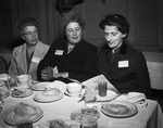 Three Cowbelles, each wives of American National Cattlemen's Association members, discuss the program at a luncheon at Hotel Texas. They are, left to right, Mrs. Wallace Walton of Centerville, Utah; Mrs. Eugene Hall, Raymond, Idaho, and Mrs. Stanley Hall, Houston. The Cowbells is an auxiliary of the American National Cattlemen's Association.