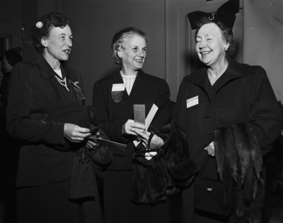 Three Californians meet in Texas at the convention of the American National Cattlemen's Association now in session in Fort Worth. The women, members of the Cowbelles, are, left to right, Mrs. Joseph Sonza of Cayucos, California; Mrs. Glen Cornelius, Solvang, California, and Mrs. Paul Cornelius, Coleville, California. The Cowbells were an American National Cattlemen's Association auxiliary.