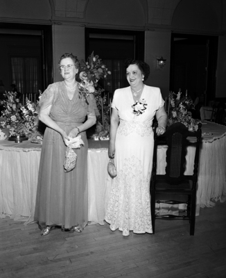 Mrs. O. R. Grogan, left, in a floor length dress with flowers pinned to her left shoulder, Woman's Club President, with Mrs. T. J. Harrell, first vice president, also in a flowy floor length dress, but, with a flower pined at the center, headed the receiving line at the tea given in Mrs. Grogan's honor by the club. Published in Fort Worth Star-Telegram morning edition March 9, 1950.