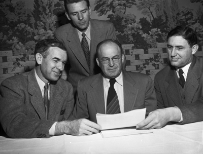 J. H. Parrish of Pure Oil Company, standing, was elected secretary. Other officers, seated, left to right, are Thomas Nichols, Rowan Oil Company, second vice president; D. G. Stookey, Texas Company, first vice president; and J. J. Uri, Texas Pacific Coal and Oil Company, treasurer. They comprise the new officers of the Fort Worth Geological Society.