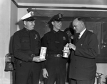 Police Chief R. R. Howerton, right, is shown with Patrolman Paul Crawford, left, and Desk Officer J. E. Fitzgerald as the two uniformed officers and other city policemen began March of Dimes solicitation.