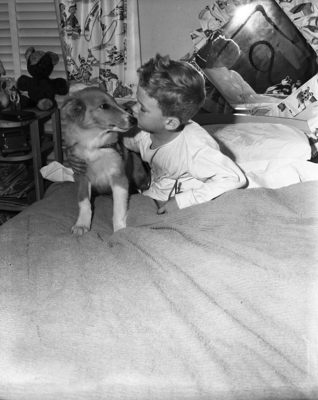 Image shows Roy Edward Daniel kissing his collie puppy.