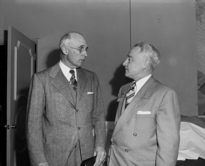 Albert K. Mitchell of Albert, New Mexico, left, Western rancher, chats with Rilea W. Doe of Oakland, California, vice president of Safeway Stores at the convention here of the American National cattlemen's Association.