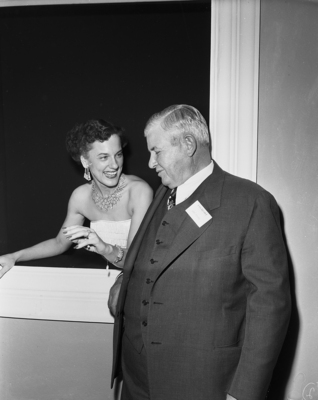 Dinner given at Rivercrest for members of the American National Cattlemen's Association. Roy Parks of Midland, who claims to know more about cattle than jewelry, admires the "glitter" when Mrs. Icybelle Richardson modeled at the buffer dinner given Tuesday at River Crest Country Club.