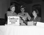 Mrs. O. W. Lynam of Burdett, Kansas, center, new national president of Cowbelles, American National Cattlemen's Association auxiliary, and Mrs. Bert McGee of Cheyenne, Wyoming, left, register with Mrs. Jere Sheldon of Madrone, California, at Hotel Texas.