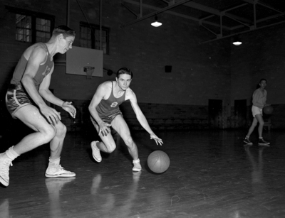 Arlington Heights' James (Excell) Amyett, left, and Bascomb Herd work out in preperation for afternoon's game with second-place Carter in the Eagles' gym. Both are seniors. Amyett is a letterman. Published in Fort Worth Star-Telegram evening edition, January 28, 1952.
