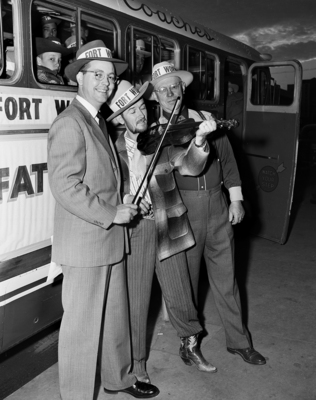 J. L. Pridemore of the North Side Lions Club, left, and Saxon Whalin, right, of the South Side Lions Club, lent an ear to Fiddler Shorty Bates before a group of Lions left for a swing through Central Texas to boost the 1952 Southwestern Exposition and Fat Stock Show. Pridemore and Whalin are trip co-chairmen. They all are wearing hats labeled, "Fort Worth." Published in Fort Worth Star-Telegram evening edition January 8, 1952.