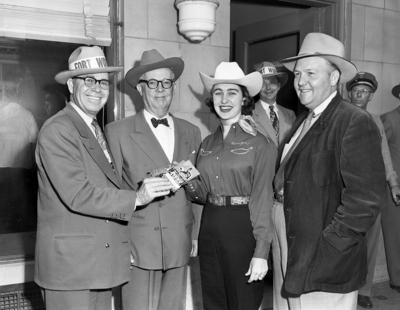 Joe Loe, left, Fort Worth attorney, invited this Waco trio to the Southwestern Exposition and Fat Show. They are Judge Jake Tirey, associate justice of the 10th Court of Civil Appeals, second from left, Miss Carolynn Casey, 18, Baylor freshman and Longhorn Club Sweetheart to the show for Waco Day, and Bud Collins, president of the Waco Longhorn Club. Published in Fort Worth Star-Telegram morning edition January 9, 1952.