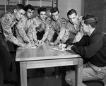 Grady Cook (right), sponsors of the Arlington State College Boxing Club, gives out information on the Fort Worth regional Golden Gloves tournament to five club members, all novice lightweights. Left to right are Jackie Brown, Marvin Rowett, Fred Hight, Bobby Parker and Arthur Clark. Published in Fort Worth Star-Telegram morning edition January 9, 1952.