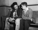 Ronald Smoot, 14, right, is shown consoling his brother, Eddie, 15, who shot to death their father in the family apartment at Fort Worth as a climax to an argument between the father and mother. The boy fired three.22 caliber rifle slugs into Edgar Smoot, 38, a T7P Railway brakeman, at about 7:40 pm Monday, January 7. The picture was taken outside the county probation office, where disposition of the case was being discussed. Published in the morning edition, January 9, 1952.